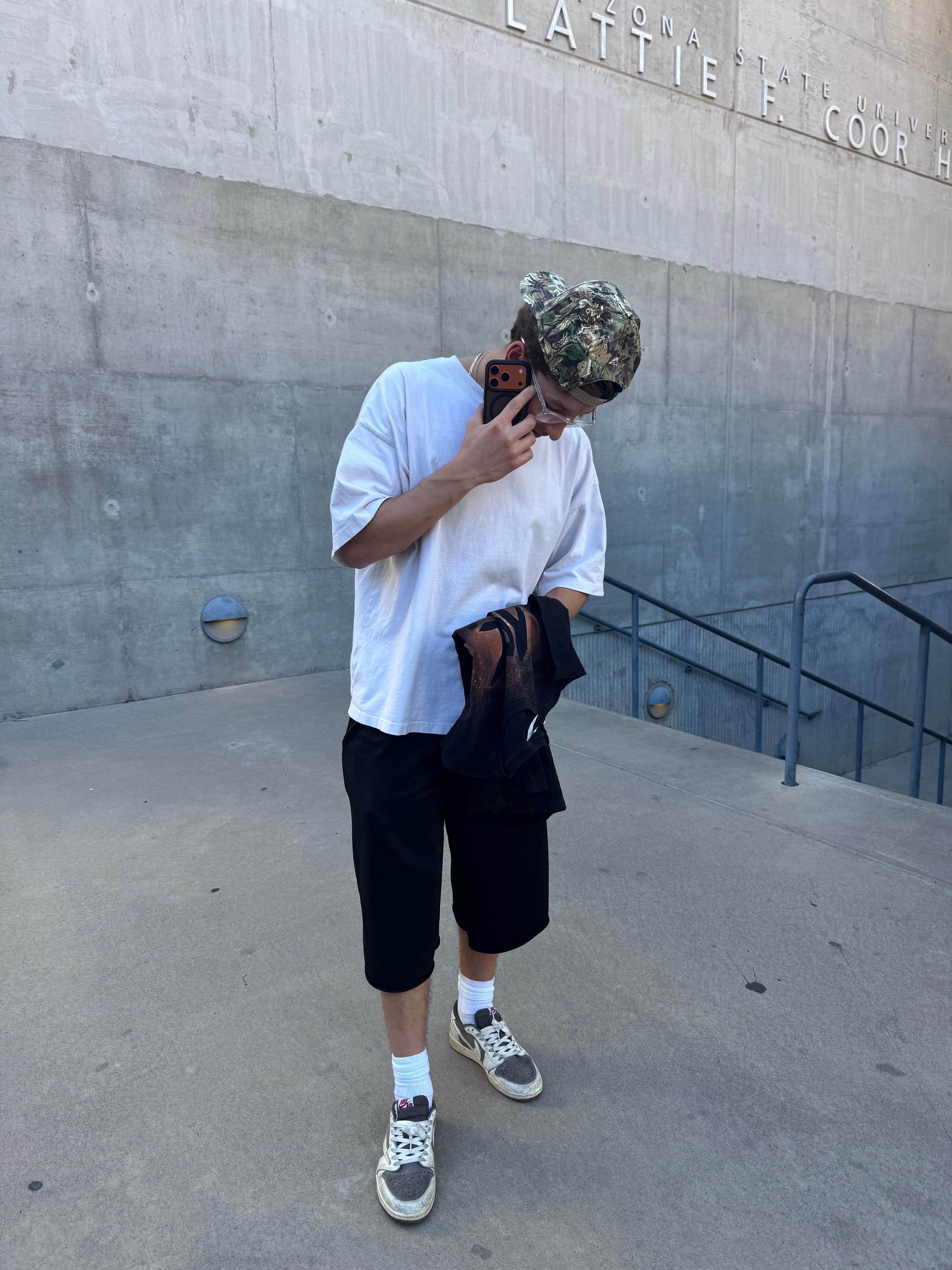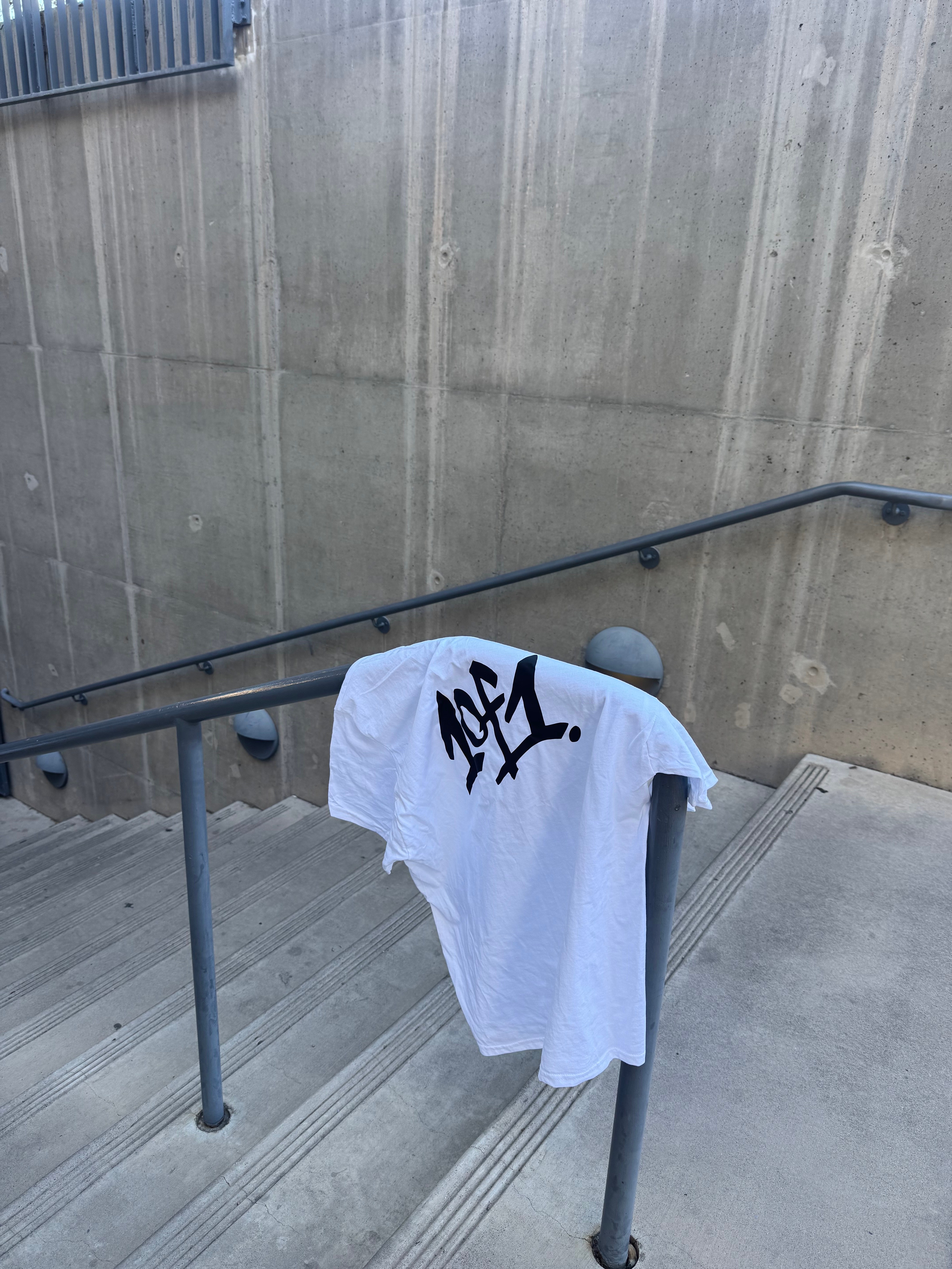 white oversized t-shirt with large black graffiti-style "1OF1." brush script logo